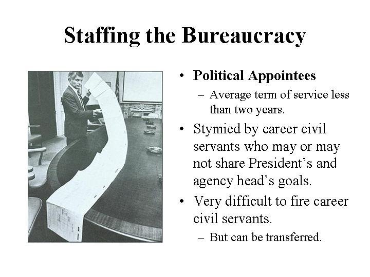 Political Control of Bureaucracy • Who should control the bureaucracy? – Bureaucracy should be responsive to elected officials (Congress, the President) • Members of the bureaucracy are not elected, and must be held accountable for their actions • Making them responsive to elected officials give the public a voice in bureaucratic operations – The bureaucracy should be free from political pressures • They should be autonomous