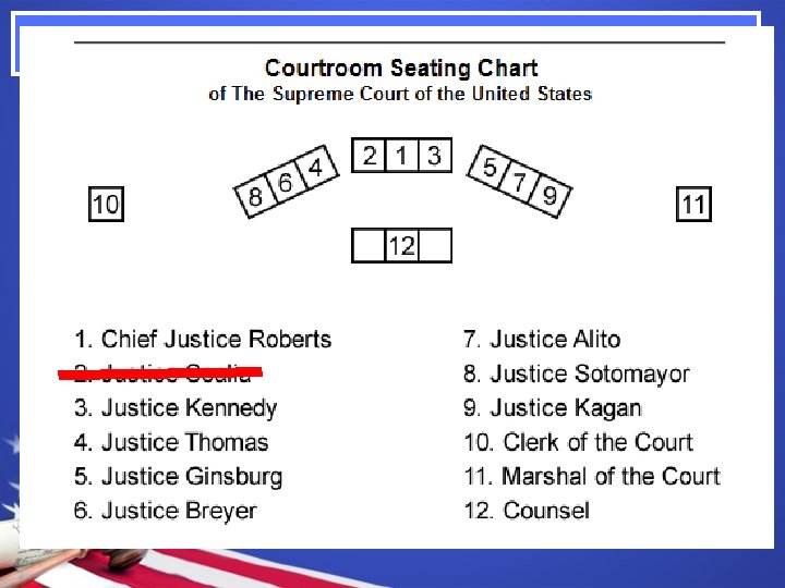 Composition of the Supreme Court • Number of Justices – 9 • 1 Chief Justice • 8 Associate justices