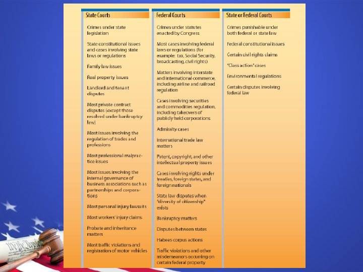 Jurisdiction • Definition: court’s authority to hear a case Federal vs States • Federal Courts: – Cases involving federal law, treaties, and the interpretation of the Constitution • State Courts: – Cases involving state law