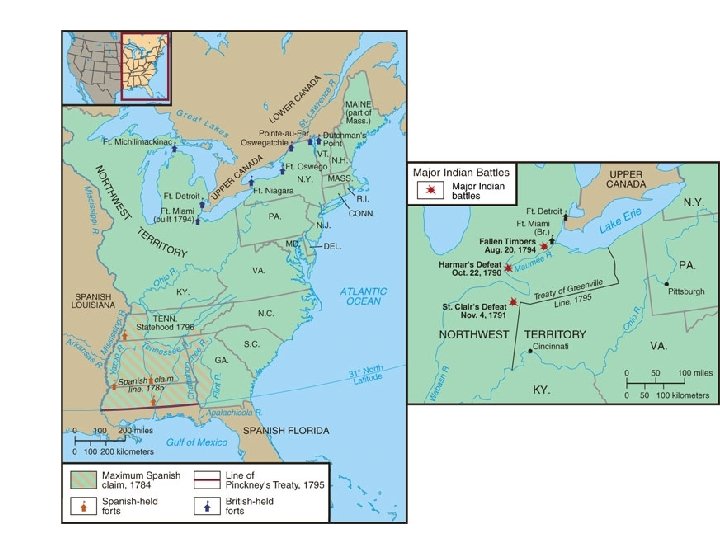 Problems with Native Americans • 1794 – General “Mad Anthony” Wayne defeated Shawnee Indians at the Battle of Fallen Timbers opening up the Ohio Valley to White Settlement with the Treaty of Greenville. The natives had been supplied with alcohol and guns by the British who still occupied forts on American Soil.