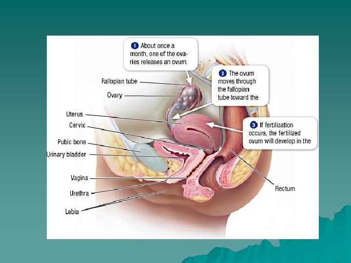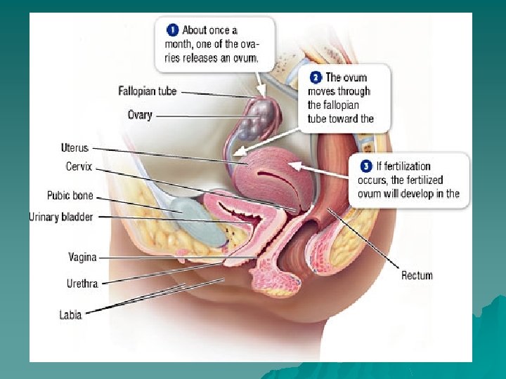 OVARIES Tiny glands which contain egg cells (ova) u At birth 100, 000 -200, 000 are located in each ovary u – Once a month, from age 14 -45, an egg is released from opposite ovaries u Functions: – To produce egg – To produce hormones – estrogen (puberty) and progesterone (prepares uterus for pregnancy, lactation)