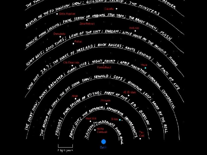 We are leaking signals to space. TV shows from the 50’s are now 5, 860, 000, 000 mi. “out there”. u WHAT WILL THEY THINK OF US? u
