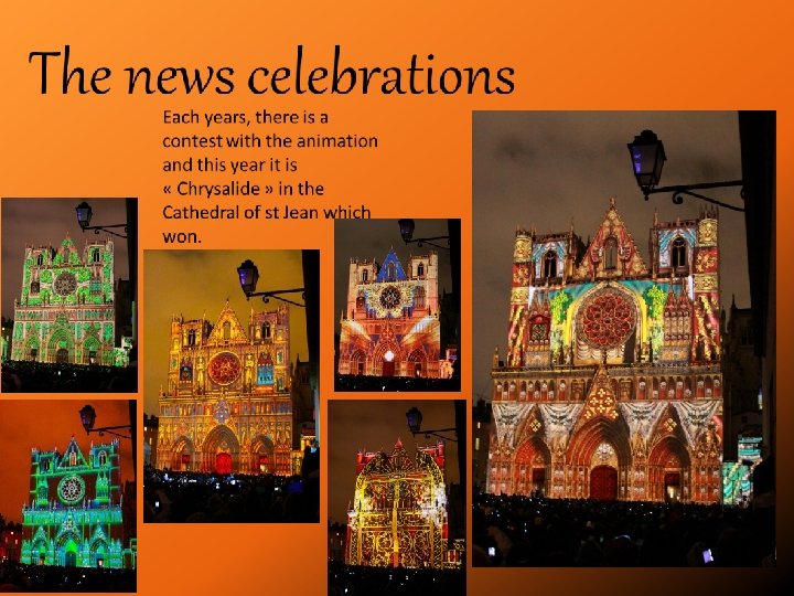 The news celebrations In 1989, Michel Noir the mayor decided to accompany the traditional illuminations by animations. This decision permit to attract millions tourist in Lyon during this period. Now, there are 80 artistic animations in the famous places in Lyon : Bellecours, St jean, Fourvière, “la place des celestins”… Now, example of animation during 2012 …