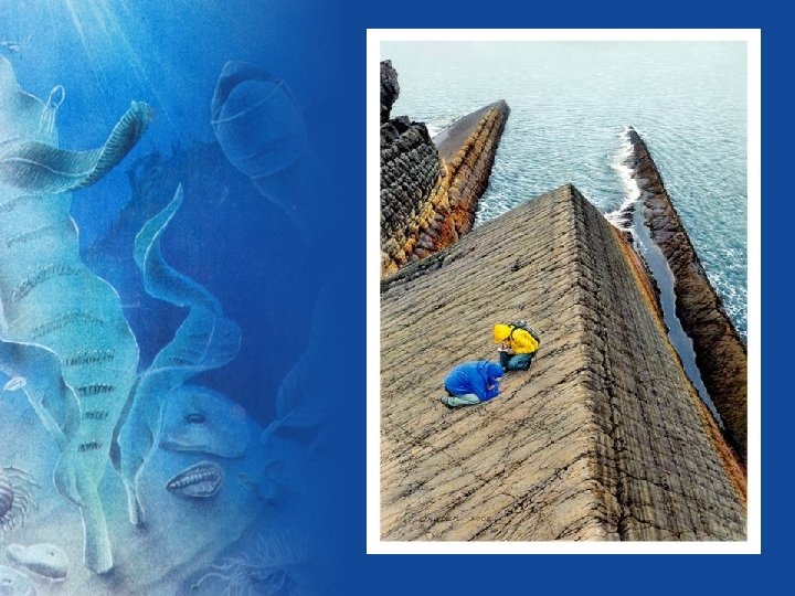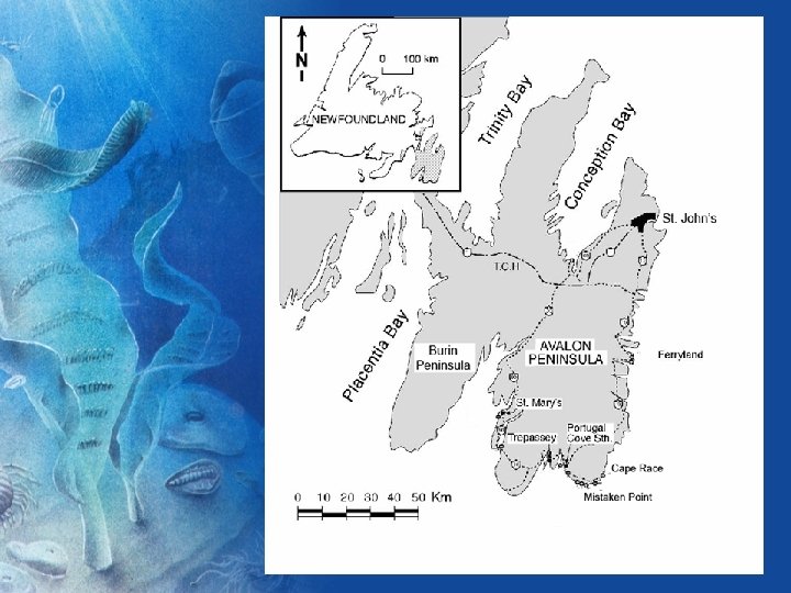NEWFOUNDLAND The first really big animals (@575 +/- 1 Ma) • Oldest Truly Macro-Ediacara Biota (Mistaken Point) Dominated by Rangeomorphs, whose relationships are not understood? • Deep Water Setting • Excellent Dating Possible Because of Ashes