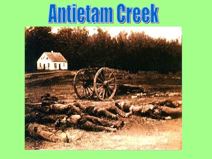 Battle of Antietam Creek: Sharpsburg, Maryland Union Commander: General George Mc. Clellan Confederate Commander: General Robert E. Lee September 17, 1862 Casualties: Union-12, 410 Confederate-13, 724 Winner: Union