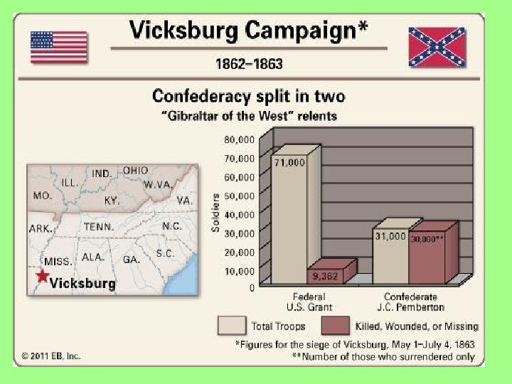 Significance: One of the most important strategic victories for the Union because it split the Confederacy in half. The CSA lost control of the Mississippi River. General Grant proves himself again.