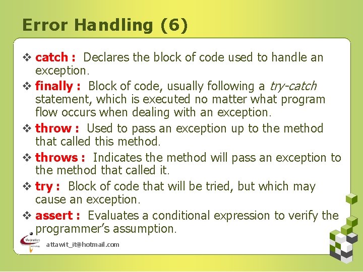 Error Handling (6) v catch : Declares the block of code used to handle an exception. v finally : Block of code, usually following a try-catch statement, which is executed no matter what program flow occurs when dealing with an exception. v throw : Used to pass an exception up to the method that called this method. v throws : Indicates the method will pass an exception to the method that called it. v try : Block of code that will be tried, but which may cause an exception. v assert : Evaluates a conditional expression to verify the programmer’s assumption. attawit_it@hotmail. com