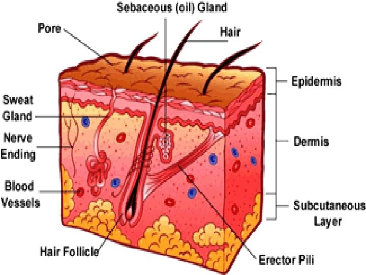 Hair structure • Consists of dead keratinized cells • Shaft (superficial portion of hair) • Follicle (epidermal cells that grow down into dermis forming a tube) • Hair papilla (contains germinal layer of cells and blood vessels to nourish growing cells) • Root (developing hair that is contained in the follicle) • Follicle and dermal papillae attached by erector pili muscle