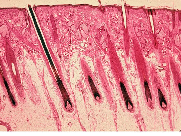 Hair growth • Germinal cells in the hair papilla reproduce, keratinize and die • Scalp hair grows for 2 -6 years then rests for 3 months • When growth stage resumes old hair is shed