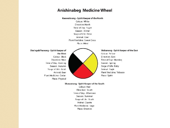 The Medicine Wheel � The teachings of the Medicine Wheel were originally explained orally with the circle being drawn in the earth and a gradual overlaying of symbols, as meanings were explained by an elder. ◦ Explanation of the Four Directions ◦ center of the wheel which represents the Sacred Mystery. ◦ The Four Aspects of Human Personality-the physical, mental, emotional, and spiritual; ◦ The Seasons-the changing from fall, winter, spring and summer, occurs in a cycle; ◦ The Four Stages of Life-childhood, adolescence, adulthood, and elders; ◦ The Races-red, white, black and yellow; ◦ The Four Elements-water, air, fire, and earth. � These wheels within wheels are used to explain and examine such concepts as those emotions that impede personal growth and the development process that involves leading a person to wholeness.