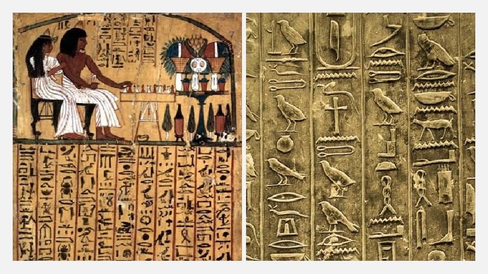 MORE ABOUT EGYPT • When Menes/Narmer took control of Egypt, the writing system of hieroglyphics (created by priests) first surfaced. Scribes were the specialists of this form of writing. Hieroglyphics was written on papyrus. • Egyptian kings were known as pharaohs. • Pharaohs had absolute monarch power meaning their ruling power was unlimited. The people believed the pharaohs were living gods (Horus). • Crops from farmers were used as a form of taxes, government officials would use surplus gains to be given to non-farmers and for large publicwork projects (like building the pyramids). • By 2500 B. C. the first stone pyramids in Giza appeared.