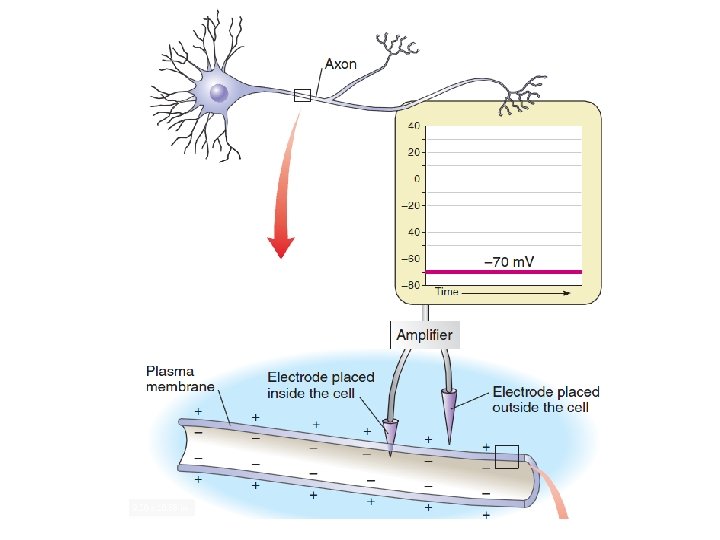 The resting potential When a neuron doesn’t work, it’s at its resting potential. At the resting potential, there is a difference between the electric charge of inside the cell and outside the cell. The cytoplasm of the neuron is slightly more negative than the extracellular fluid(-70 m. V). In fact, the membrane of the cell is polarized because it has a positive pole and a negative pole.