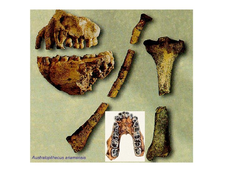 Australopithecus anamensis • Found by Meave Leakey (pictured) and Alan Walker 1994, Lake Turkana, Kenya. • 4. 1 – 3. 9 mya. • Paltry fossil record: ten teeth (unrelated), leg, arm, skull parts, jaw parts. • Resembles a chimp; ramidus teeth (large canines). • Leg bones suggest more upright and human-style walking. • Arm bones suggest arboreal.