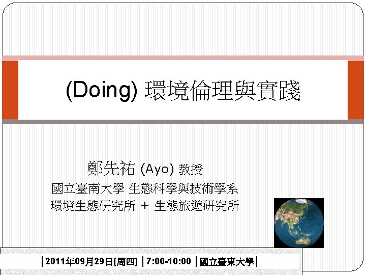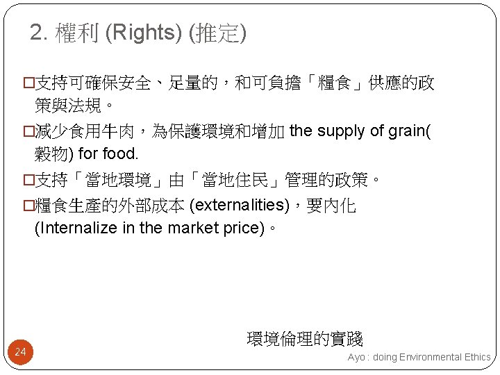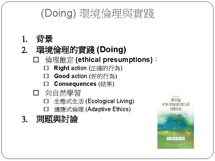 正義:一場思辨之旅 � JUSTICE: What's the Right Thing to Do � 作者:邁可.桑德爾 (Michael Sandel) � 譯者:樂為良 � 出版:雅言文化 � 日期: 2011年 03月01日 31 Ayo : doing Environmental Ethics
