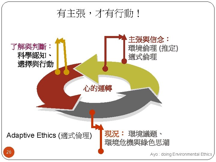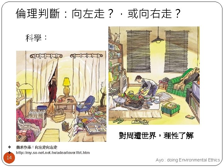 倫理判斷:向左走?,或向右走? � 幾米作品:向左走向右走 � http: //my. so-net. tw/adearlover/ltrt. htm 13 Ayo : doing Environmental Ethics