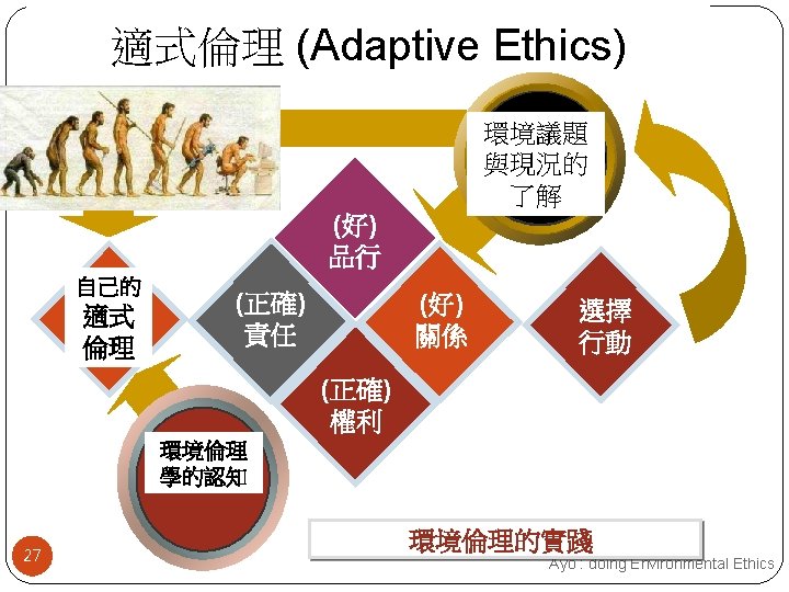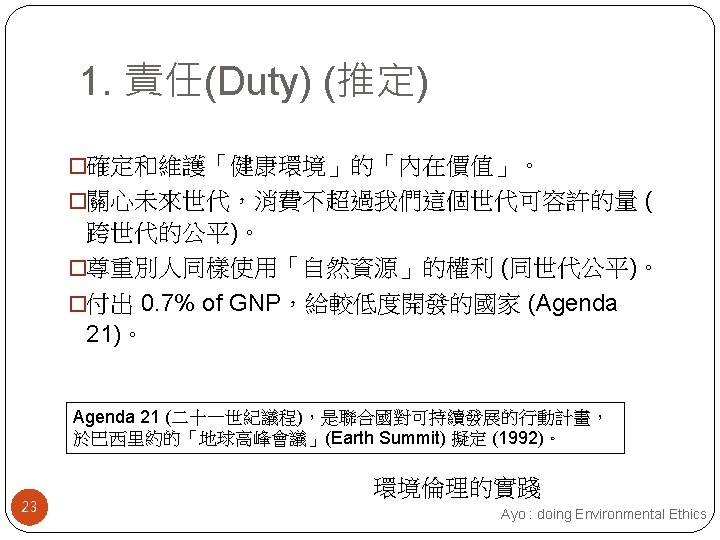 倫理實踐的 作表 (adaptive) �環境議題 (environmental issue): �了解與描述環境議題的內涵 �建構 ethical presumptions �Give reasons (理由) for responding to this issue based on: 責任、權利、品行與關係 �考量結果 (consequences) �List the likely consequences of acting, and the evidence needed �自己的決定 (Make your decision) 22 Adaptive Ethics (適式倫理) Ayo : doing Environmental Ethics