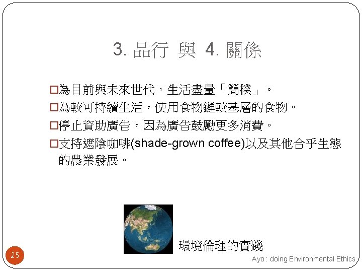 可持續發展的 Basic 3 E: � 科學知識與能力: 1. 2. � 判斷與選擇: 3. 17 Ecology (生態學) Economics (經濟學) Env. Ethics (環境倫理學) Ayo : doing Environmental Ethics
