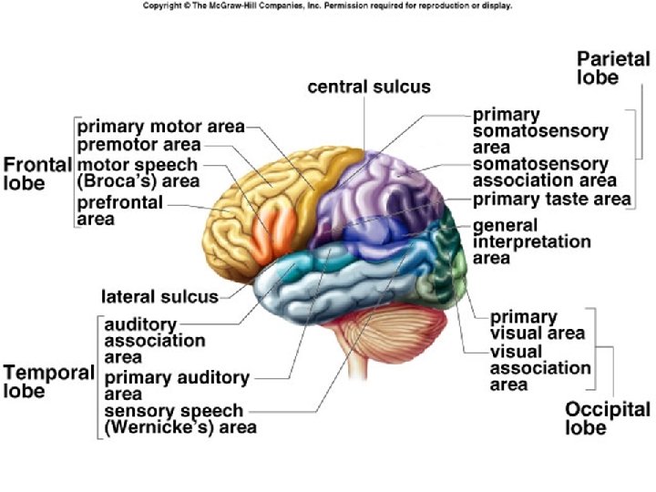 Frontal Lobe Structure • The frontal lobe is the largest lobe of the brain and makes up about a third of the surface area of each hemisphere. On the lateral surface of each hemisphere, the central sulcus separates the frontal lobe from the parietal lobe. The lateral sulcus separates the frontal lobe from the temporal lobe. • Some of the areas include: primary motor cortex, premotor cortex, Broca’s area, medial cortex & prefrontal cortex