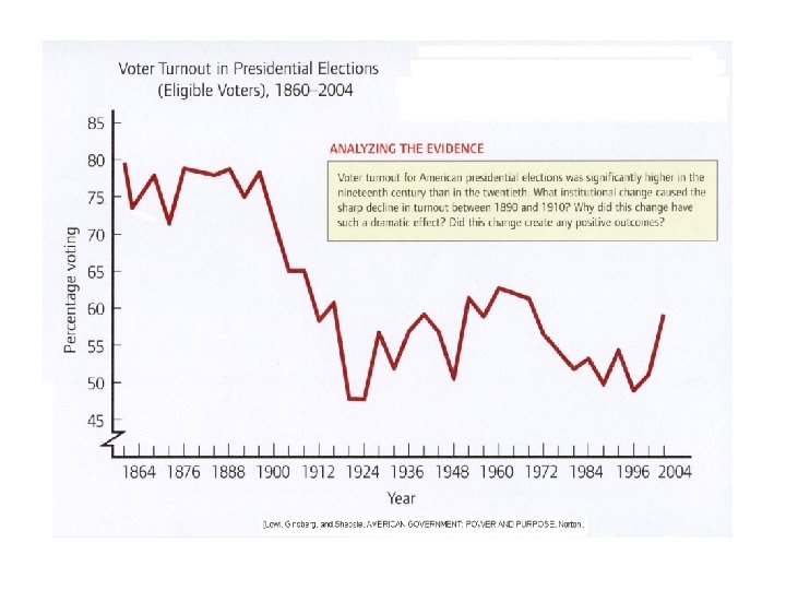 Voter Registration • Prior to latter 19 th century, no (or informal) voter registration – probably a lot of fraudulent voting – “vote early and vote often” • States adopt voter registration laws in late 19 th century – evident decline in total turnout – may also have had the effect of “vote suppression” – purging of voter registration lists • Latter part of 20 th century, general liberalization of registration laws (by states, by courts, and by Congress) – “Motor Voter” Act (1993) – Help America Vote Act (2002) [provisional ballots] • Voter registration remains something of a mess in some states and localities – “deadwood” problem