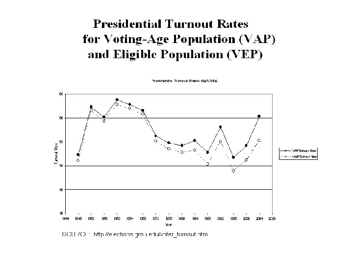 Voting Turnout • “Total actual vote”/ “Total potential vote” • In the U. S. voting turnout is usually calculated as – total recorded vote for President, divided by – the census estimate of the voting age population (VAP) • However, such turnout is often (mistakenly) characterized as the percent of eligible voters who actually voted. • Poll workers who report “high” turnout on election night are looking at number of voters who showed up as a percent of registered voters on their lists.