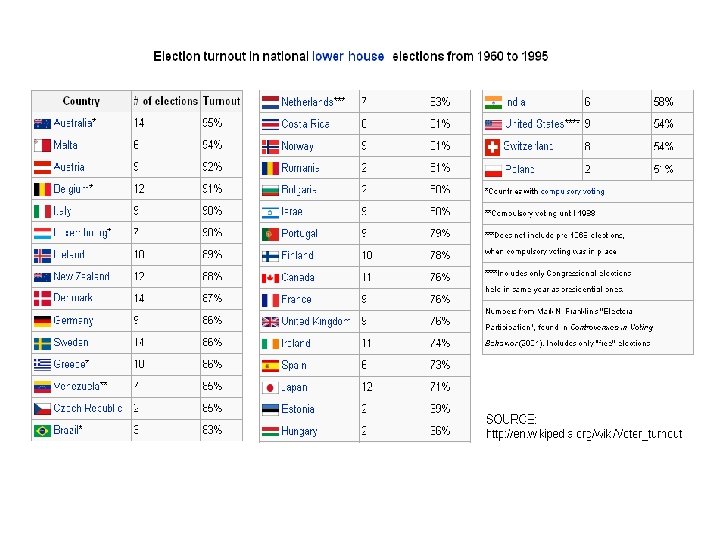 Some Reasons for Turnout Differences • Some countries have compulsory voting • Most countries have (national) voter enrollment (vs. state voter registration) systems • U. S has unusually frequent elections with many offices/propositions at stake in each (“longballot”) – federal/state/local offices – separate executive and legislative (and sometimes judicial) elections, primaries (sometimes with runoffs) – referendums – plus primaries (and sometimes runoffs)
