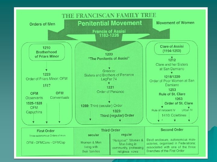 Overview u Francis and Clare had a marvellous effect. This is not surprising since the social system in which Francis grew up was not very aware of the Gospel and the poor Jesus of Nazareth. Many people who were unhappy with the state of affairs (beguines, poverty movement, penitential movement, albigensian a. o. ) were searching for an alternative way to live. u At first, Francis had also worked out such an alternative way for himself personally, without any intention of forming an order. However, brothers were then given him (Test 14) (= First Order). Soon after that sisters were given to him as well (= Second Order). There were also people who converted in the encounter with Francis. Life of penance (= Third Order)