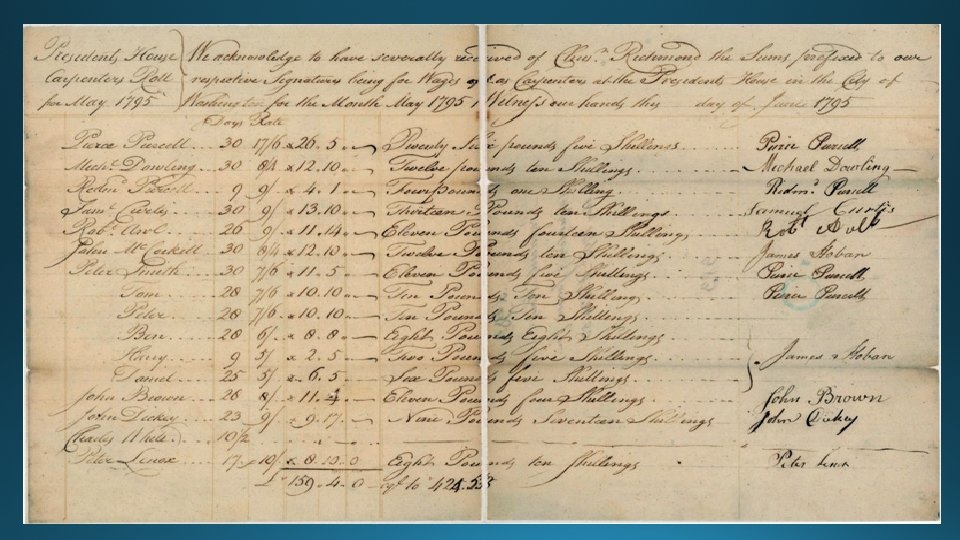 In a 5 July 1792 letter to a Georgetown merchant named John Laird, who was going back to Scotland, the commissioners offered to pay 12 shillings Sterling a month for laborers he might find in Scotland, single men only. They also sought indentured servants, promising freedom to common laborers after two years work, less time required from mechanics: "They will be employed in public work only, and their living found as free men, we desire the Mechanicks to work only, Sixteen Months, and the Laborers two Years, from their arrival at this Port. " (Commrs letterbook vol. 1 pp 97 -8