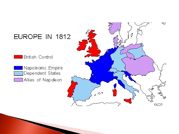 Napoleon’s Defeat � Campaign of 1812 against Russia - 600, 000 men in the Grande Armee - 40, 000 only returned to France. Russians used a “scorched earth policy”. During the Winter months the Russians defeated Napoleon. � 1813 Battle of Leipzig -- Napoleon lost � 1814 April 11 - abdicated - exiled to island of Elba � 1815 February - escaped from Elba - marched to Paris in the “Hundred Days” - soldiers rushed to fight under Napoleon � Battle of Waterloo - Wellington defeated Napoleon � Exiled to St. Helena - very remote location with little chance of escape, died in 1821 supposedly of cancer but now it is believed that his wine was poisoned with arsenic