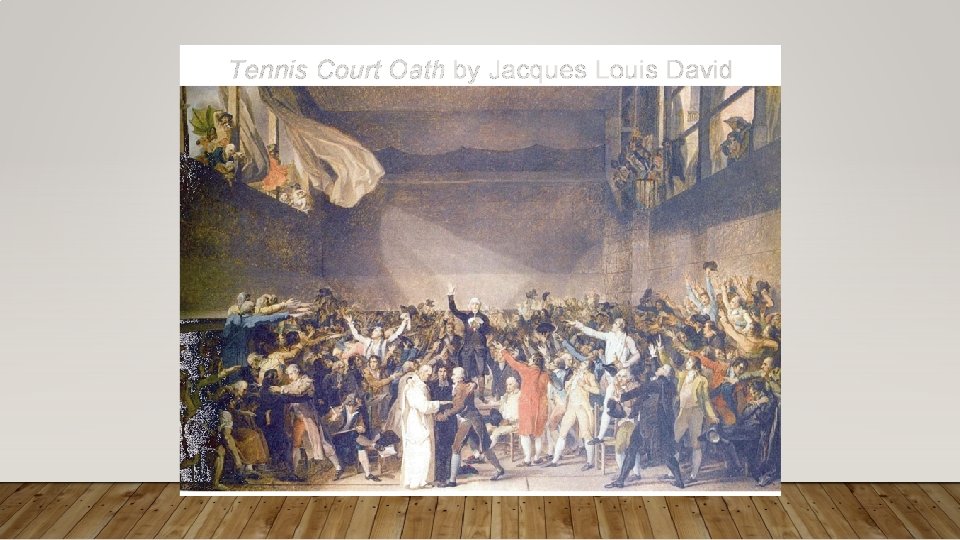 THE TENNIS COURT OATH “The National Assembly, considering that it has been summoned to establish the constitution of the kingdom, to effect the regeneration of the public order, and to maintain the true principles of monarchy; that nothing can prevent it from continuing its deliberations in whatever place it may be forced to establish itself; and, finally, that wheresoever its members are assembled, there is the National Assembly; “Decrees that all members of this Assembly shall immediately take a solemn oath not to separate, and to reassemble wherever circumstances require, until the constitution of the kingdom is established and consolidated upon firm foundations; and that, the said oath taken, all members and each one of them individually shall ratify this steadfast resolution by signature. ”
