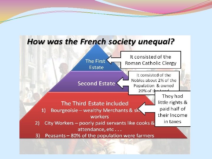 The French Society �The French society was divided into classes or estates. �There were two privileged classes – the clergy and the nobility �They were known as the First Estate and the Second Estate �Their lives were characterized by extravagance and luxury.