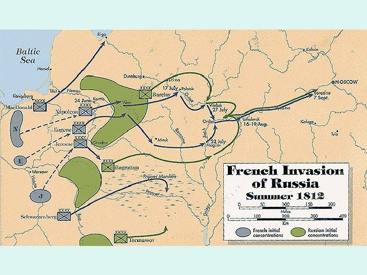 Mistake # 3: The Invasion of Russia 1 st - Napoleon decides to invade Russia because of several factors: • Russia never stopped selling grain to Britain 3 rd – As Napoleon’s army enters Russia, The Russian Czar (Alexander) pulls back his troops because he knows that the battle is unequal. They retreat to Moscow & on the way they begin to burn grain fields & kill livestock so that the French would not be able to eat. Scorched – • French & Russian rulers suspect each other of having competing design on Poland earth policy 2 nd - In June of 1812, 4 th – On Sept. 7 th, 1812, the 2 armies finally clashed in the Battle of Borodino. Napoleon & his army of 400, 000 march into Russia. NOTE: Many of his troops were from other parts of Europe & they felt little loyalty to Napoleon. As a result, soldiers desert the French army to search for food. After several hours of fighting, the Russians retreated, allowing Napoleon to take Moscow.