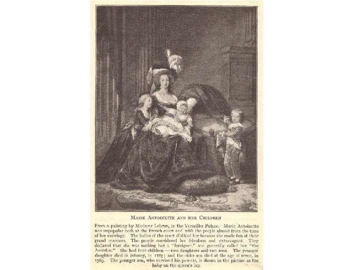 Marie Antoinette • As part of an alliance pact between Austria and France. Marie Antoinette was pledged to Louis XVI in marriage • She married at the age of 15 • Became queen at 19 • Marie Antoinette helped provoke the popular unrest that led to the French Revolution and to the overthrow of the monarchy • She became a symbol of the excesses of the monarchy