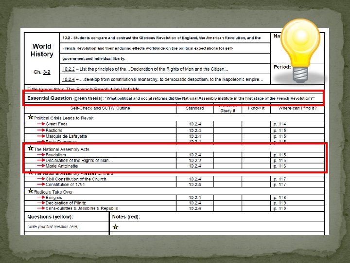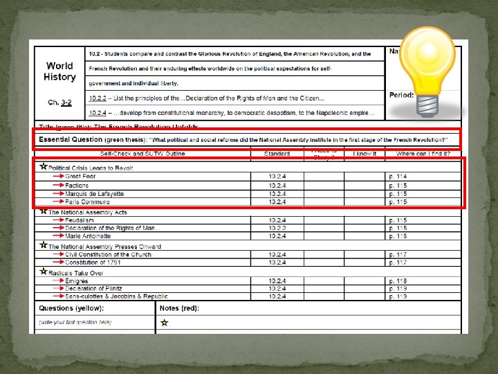 Let’s continue our rough draft 1. Write a question for each starred heading – “What political crisis led the National Assembly to institute reforms during the first stage of the French Revolution? ” 2. Write your response to each question – “The Great Fear in the countryside lead to a revolt. This in turn created factions in Paris as people and groups struggled for power. ”