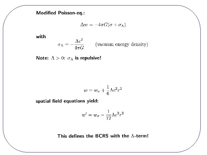 Conclusions If one is interested in cosmology, position vectors or radial coordinates of remote objects (e. g. , quasars) the present BCRS is not sufficient the expansion of the universe has to be considered modification of the BCRS and matching to the cosmic R-W metric becomes necessary