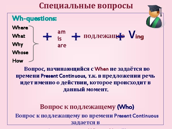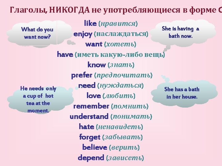 Statements, questions and negations Отрицательное Утвердитель ное предложени He is writing. е Вопросительное предложение He is writing. Is he writing? предложениеc He is not writing. Короткие ответы Short answers Yes, he is. No, he isn’t.