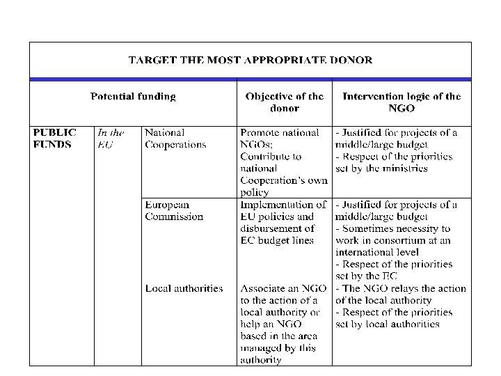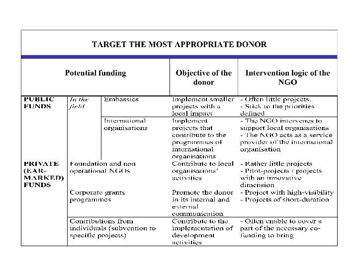The funding strategy • Identify one main donor (EC, national cooperations, United Nations), and -if possible - for several years. • Complete with smaller contributions from other donors (foundations, NGOs, etc).