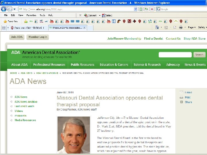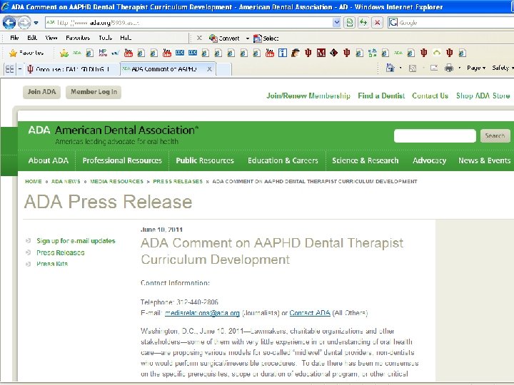 ADA opposes other models • The ADA opposes the other models of providers because they are able to perform ‘surgery and irreversible’ procedures • ADA policy emphasizes the dentist’s role as the leader of the dental team who performs examinations, diagnoses, treatment planning and surgical/irreversible procedures that are defined as the cutting or removal of hard or soft tissue • “If your only tool is a hammer, every problem looks like a nail, ” (ADA, 2011) speaking against the Dental Therapist, ADHP, and DHAT (Alaska model)