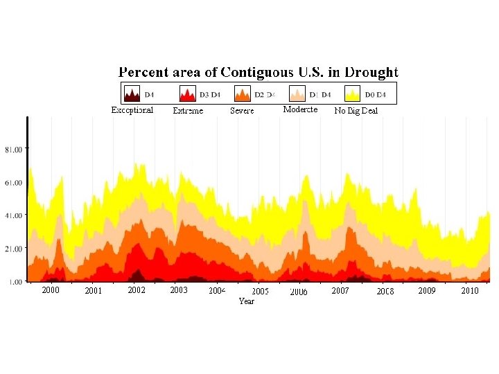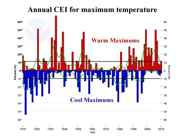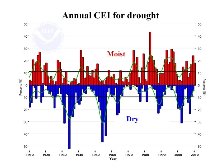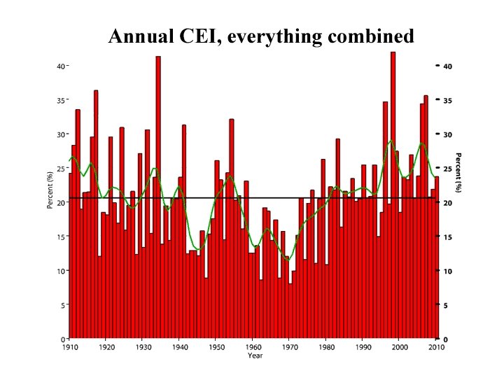 The National Climatic Data Center’s Climate Extremes Index (CEI): 1. Percentage of U. S. with max temperatures much below normal and much above normal. 2. Percentage of U. S. with min temperatures much below normal and much above normal. 3. Percentage of U. S. in severe drought and with severe moisture surplus. 4. Percentage of U. S. with a much greater than normal proportion of precipitation derived from extreme (equivalent to the highest tenth percentile) 1 -day precipitation events. 5. Percentage U. S. with a much greater than normal number of days with precipitation and without precipitation. http: //www. ncdc. noaa. gov/oa/climate/research/cei. html