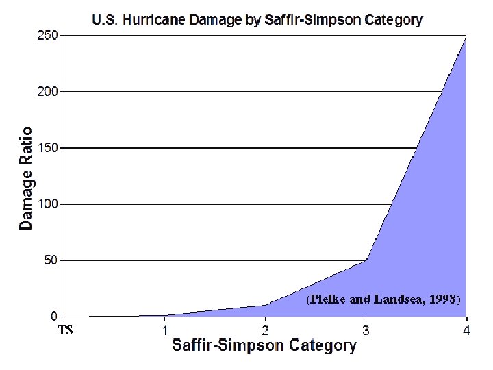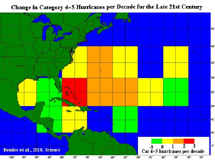 • Expect a 5% increase in hurricane winds per °C of ocean warming (Emanuel, 2005). • Expected increase in SST by 2100: 1 -2 °C. • Hurricane wind speeds should increase by 510%. • Difference in wind speed between a Cat 3 and Cat 4: 15%. • Thus, major hurricanes in 2100 should do 1. 5 - 3 times more damage than they do now.