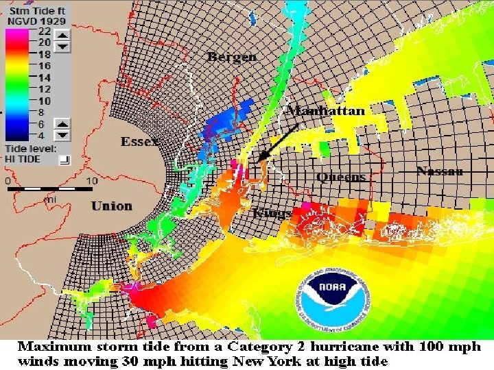 Sea level rise will lead to increased storm surge damage • 1910 -1920: NJ coast was exposed to high water levels from extreme storms less than 200 hours per year. • Early 1990's: Coast was exposed to high water from storms of the same magnitude 700 to 1200 hours per year. • No increases in storm intensity or frequency that • might account for the increasing high water levels. • Conclusion: Increase in storm surge exposure of the coast was due to sea-level rise of 1 foot over the 80 -year period (Zhang et al. , 1997)