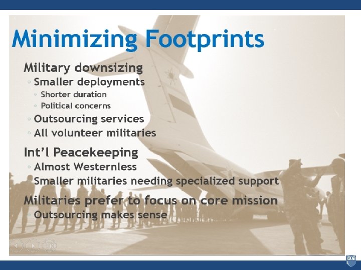FUTURE OF OCS VALUE TO GOVERNMENTS AND MILITARIES • SURGE CAPACITY VAST GLOBAL RESOURCES AVAILABLE ON SHORT NOTICE BROAD CAPABILITIES AND NICHE SPECIALIZATIONS SPEED OF DEPLOYMENT INSTANT EXPERTISE • CONTROL CONTRACTORS HANDLE OVERSIGHT REQUIREMENTS POORLY PERFORMING CONTRACTORS ARE REPLACED OR TERMINATED CONTRACTS CAN BE MODIFIED QUICKLY • POLITICAL ADVANTAGES CONTRACTORS NOT VIEWED SAME AS SOLDIERS LESS POLITICAL RISK IN POLITICALLY SENSITIVE AREAS CONTRACTOR AS “FALL GUY”