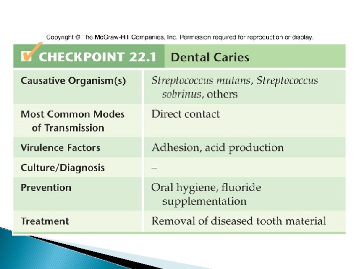 Dental Caries (Tooth Decay) Most common infectious disease of human beings Symptoms: often noticeable, but range from minor disruption in the enamel to complete destruction of the enamel and deeper layers Deeper lesions can result in infection to soft tissue inside the tooth leading to a toothache