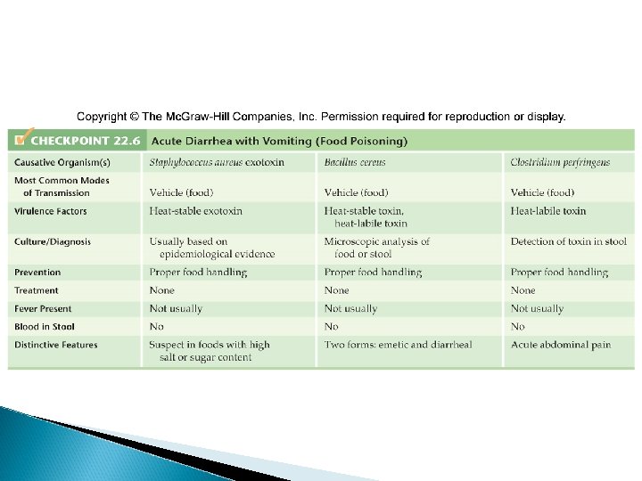 Food Poisoning by Staphylococus aureus Exotoxin • • • Associated with food such as custards, sauces, cream pastries, processed meats, chicken salad, potatoe salad, or ham that have been contaminated and then left unrefrigerated for a few hours Toxins do noticeably alter the food’s taste or smell Heating the food after toxin production may not prevent disease Symptoms: cramping, nausea, vomiting, and diarrhea Rapid recovery- usually within 24 hours
