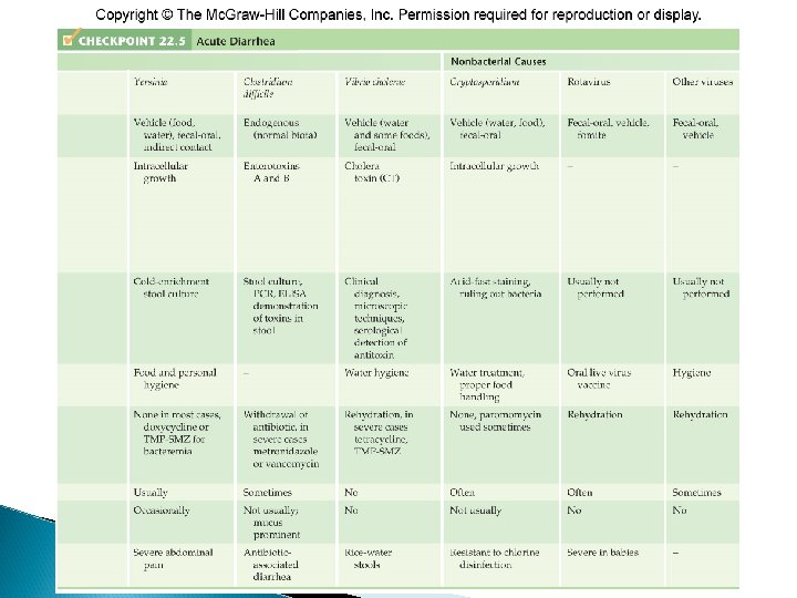 Acute Diarrhea Caused by Clostridium difficile • • • Causes pseudomembranous colitis Major cause of diarrhea in hospitals Able to superinfect the large intestine when drugs have disrupted the normal biota Produces two enterotoxins (toxins A and B) that cause areas of necrosis in the wall of the intestine Diarrhea Severe cases exhibit abdominal cramps, fever, and leukocytosis