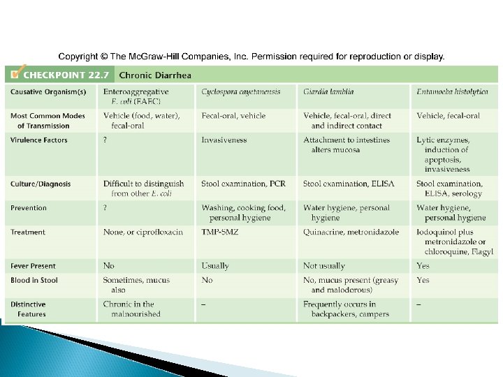 Acute Diarrhea Caused by E. coli O 157: H 7 (EHEC) • • • Most virulent strain of E. coli Enterohemorrhagic E. coli Symptoms range from mild gastroenteritis with fever to bloody diarrhea About 10% of patients develop hemolytic uremic syndrome (can cause kidney damage and failure) Can also cause neurological symptoms such as blindness, seizure, and stroke