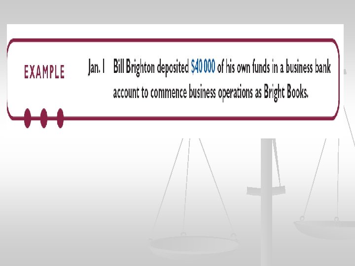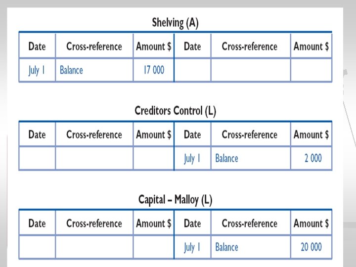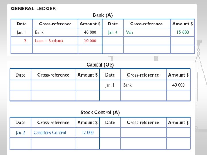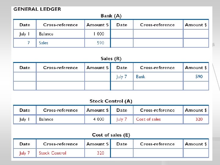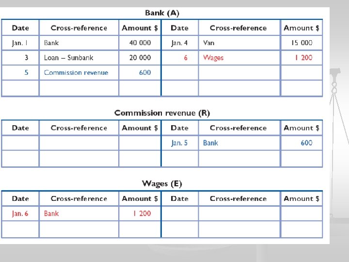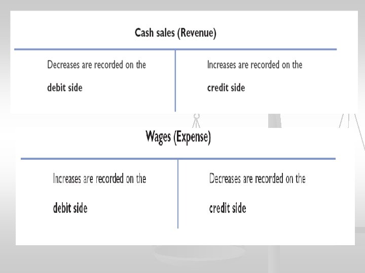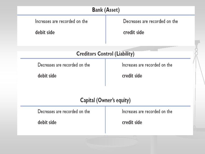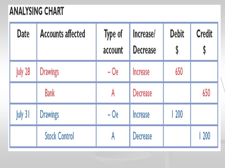 Recording procedure n n Step 1: Identify the items/accounts affected Step 2: Identify what type of accounts they are – A / L / Oe / R / E Step 3: Identify whether they are increasing or decreasing. Step 4: Use the table to identify whether the account should be debited or credited.