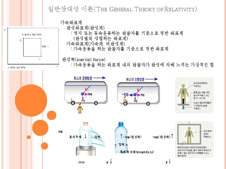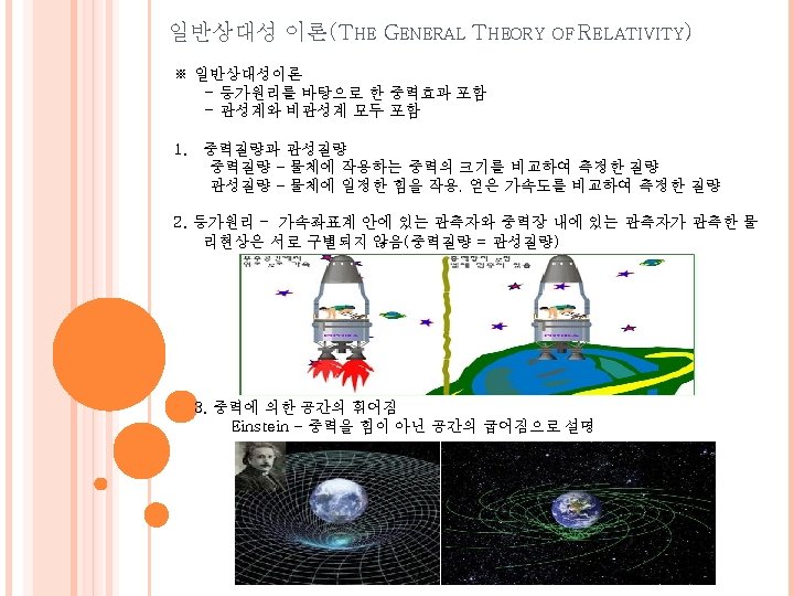 일반상대성 이론(THE GENERAL THEORY OF RELATIVITY) 3. 중력에 의한 공간의 휘어짐 - 빛의 휘어짐 중력 렌즈(lens) 현상 - Einstein 의 십자가 ( 은하와 퀘이사) ※ An outside observer sees a horizontally thrown ball travel in a straight line. Since the ship is moving upward while the ball travels horizontally, the ball strikes the wall somewhat below a point opposite the window. To an inside observer, the path of the ball bends as if in a gravitational field.