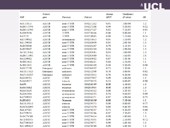 ADH Population Attributable risk * • Population attributable risk estimate = -0. 7% • British/Irish ADS individuals in England 2. 3 million • Absence of the variant in this population would mean 17, 000 more ADS cases *Natarajan et al, A simple method of determining confidence intervals for population attributable risk from complex surveys, Stat Med, 2007