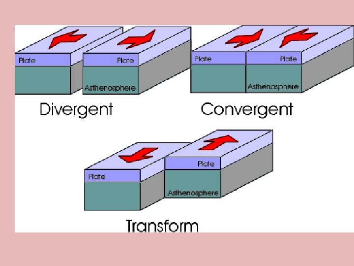 Plate Boundaries • The area where two plates meet is called a plate boundary. • Most earthquakes and volcanoes occur at or near plate boundaries Three main types of plate boundaries: 1. Divergent- separating 2. Convergent- colliding 3. Transform- scraping past