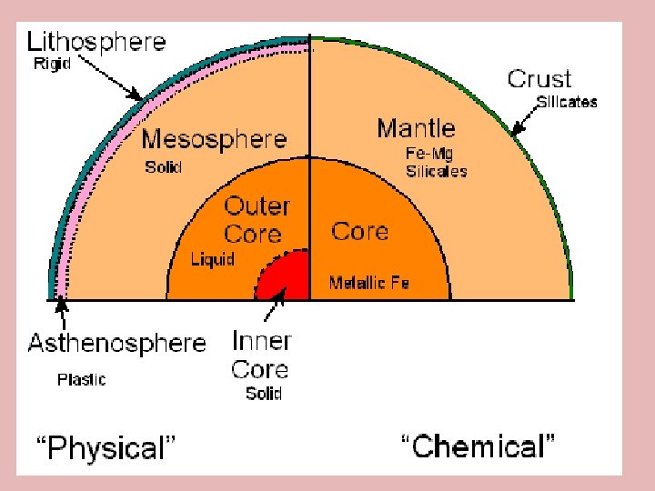 Physical Layers, cont. • Mesosphere – The rest of the mantle; molten rock • Outer Core – Liquid metal – Surrounds inner core • Inner Core – Densest layer – Solid metal